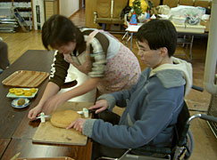 | 講師に菅原さんを迎えて、ケーキ作りに挑戦しました。 |