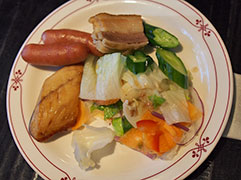 | 長芋莫久来(ばくらい) 合鴨ロース塩蒸し わさび酢 占地(シメジ)と蒟蒻の味噌白和え |